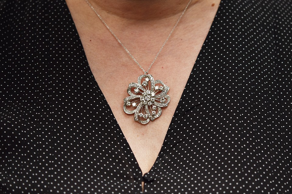 You can see that this lovely piece can be pinned anywhere you like. Here, I am showing it both offset and centered, and it looks great both ways. It could also be fastened to the cuff of a jacket, a cloth belt or a ribbon tied around the neck. Offering even more options, is a small detail on the reverse of the brooch. ![]()
