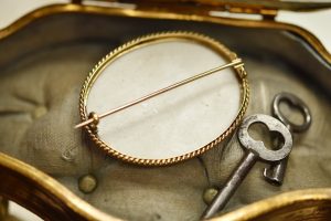 Mimicking the angel at the base of the famous painting, this brooch – a tiny portrait captured on porcelain – has been part of our inventory for more than a decade. Enveloped within an entwined rope border, this miniature masterpiece is framed in 14-karat yellow gold. Resting his rosy cheek in his chubby, dimpled hand, this charming cherub looks on in quiet adoration.