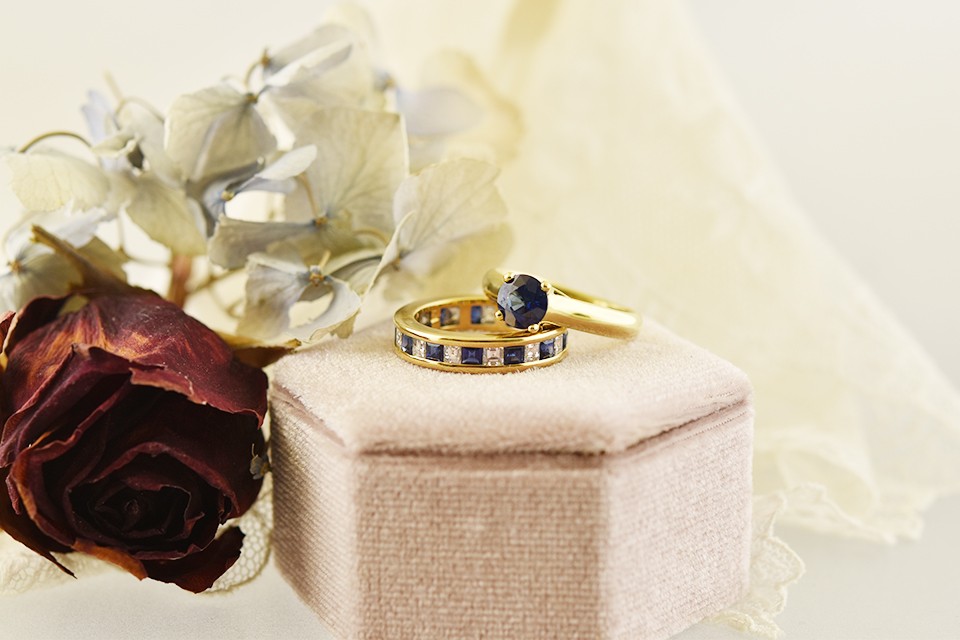 Often, choosing a wedding band is even more challenging than the engagement ring. We’ve got that covered, too. Nothing pairs better with a solitaire than an elegant eternity band. Also made from 18-karat yellow gold, this band nestles against the side of the engagement ring like a dream. Alternately set with a series of square cut diamonds and sapphires, this band is great stacked or alone. Priced at $3,950.00, it’s a must have.