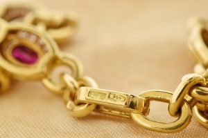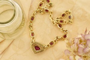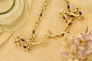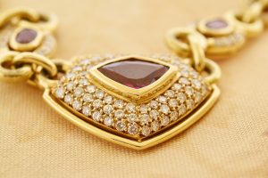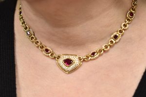 Each link is solid and substantial – the complete weight of this necklace is 41.1 dwt! It’s chunky but still refined. The ruby center falls perfectly into the hollow at the base of the throat. It’s the perfect addition for a date night or girls day! Priced at $15,000.00 – this necklace is not on our website. Call us to claim it!